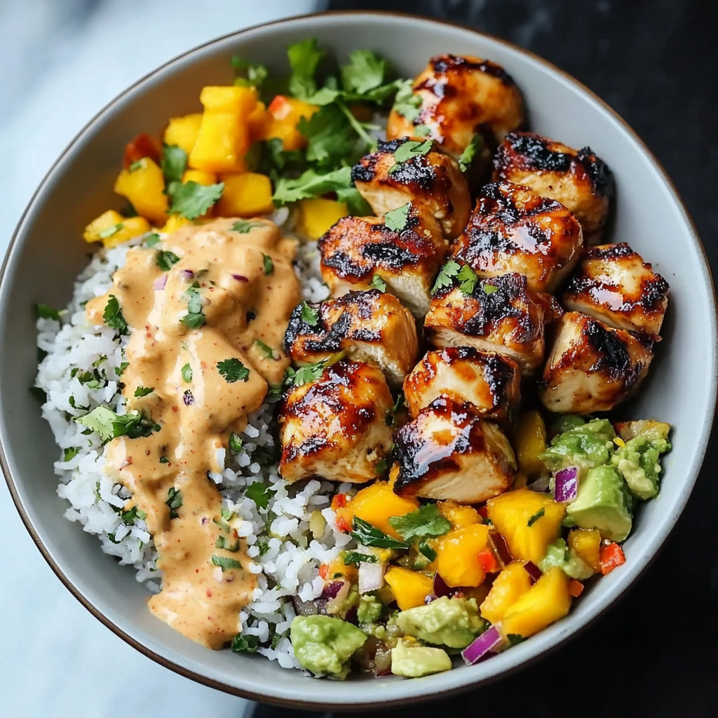 - Assemble bowls: Serve coconut rice topped with grilled chicken bites and mango avocado salsa; drizzle with chili mayo.