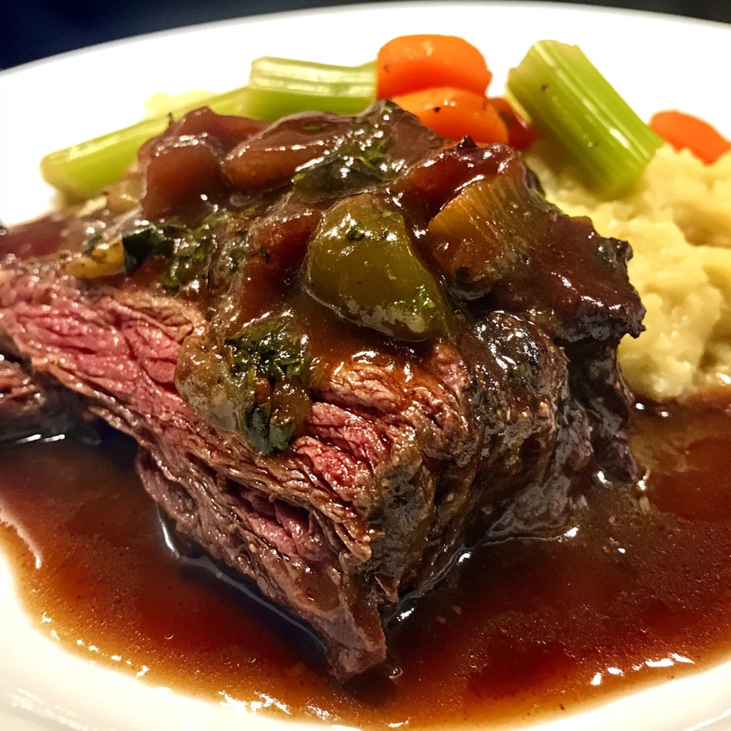 This dish is a flavorful roasted beef recipe featuring tender meat braised with aromatic vegetables and apple vinegar, creating a rich sauce.